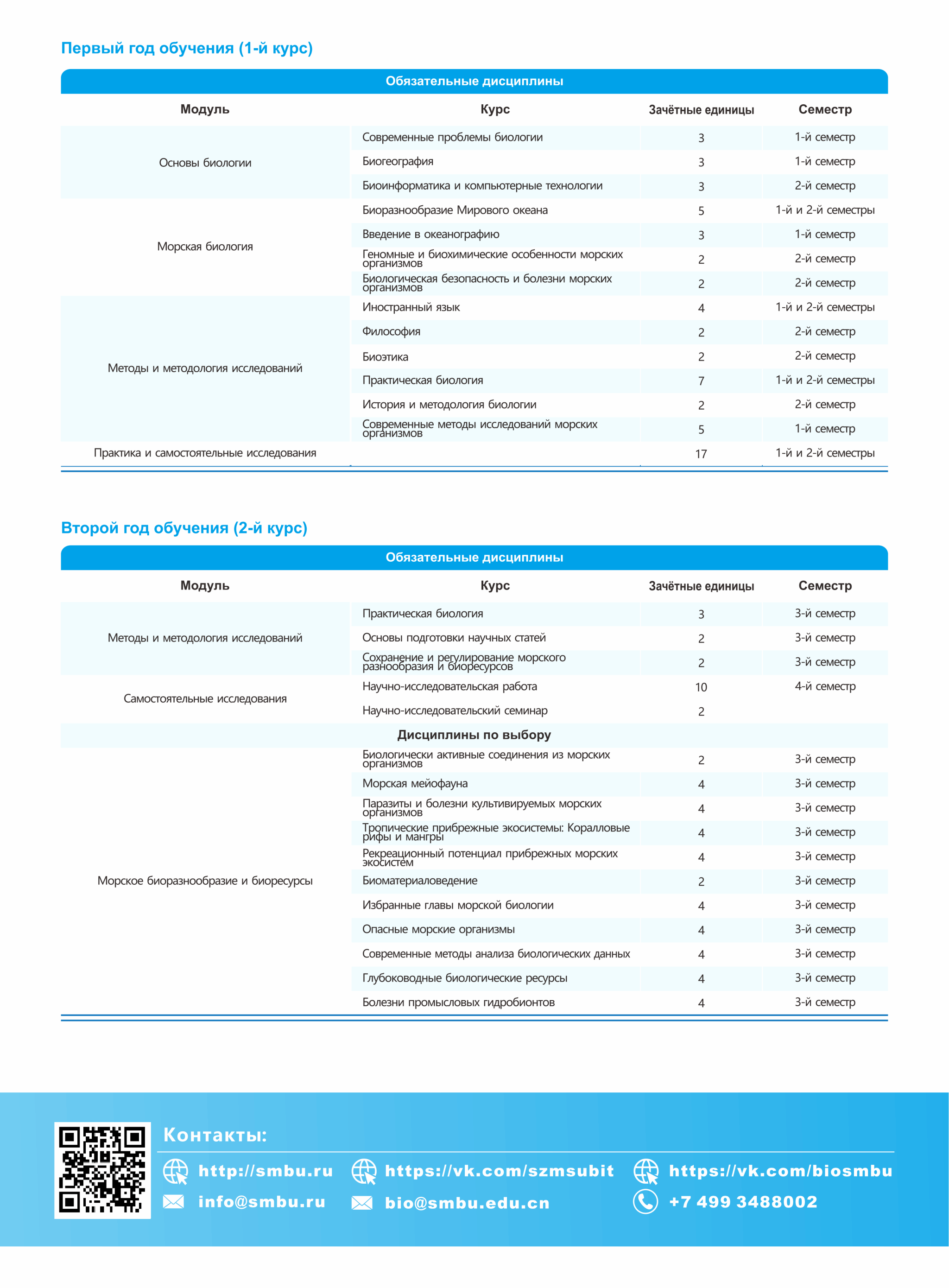 该项目以英语进行,为期两年。它包括120个学分的综合课程,要求学生每年获得60个学分,或每学期获得30个学分。第一年由必修课程组成,涵盖海洋生物学和生物多样性的各种方法和理论基础。在第二年,学生可以选择一系列选修课程,并需要完成一篇独立的硕士论文。该项目还提供了在罗蒙诺索夫莫斯科国立大学实习六个月的机会。